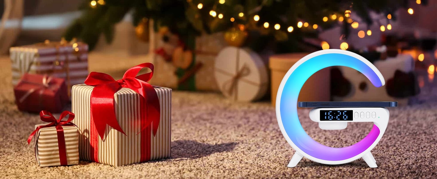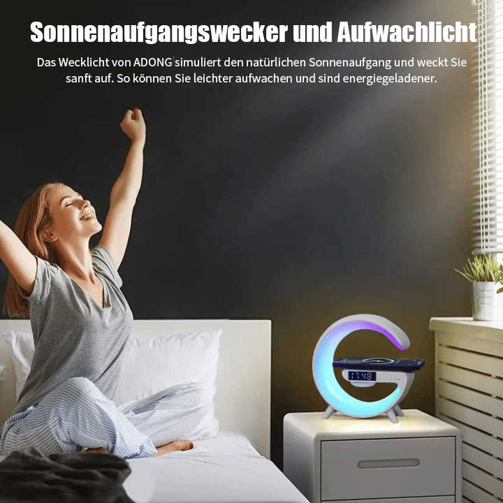 Verschönern Sie Ihren Raum mit dieser vielseitigen Lampe!🌙 Er sorgt nicht nur für die perfekte Atmosphäre, sondern ist auch ein schnelles kabelloses Ladegerät ⚡, einen Bluetooth-Lautsprecher 🎵, und eine Reihe von Funktionen wie Musik 🎶, Schlafhilfe 💤, Simulation des Aufwachens bei Sonnenaufgang 🌄, und mehr. Verwenden Sie es für die Arbeit 💼, Studie 📚, Lesen 📖, und Entspannung 😌.